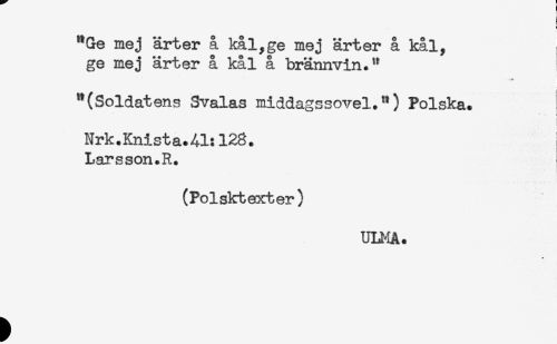 //// "Ge mej ärter å kål,ge mej ärter å kål, //// ge mej ärter å kål å brännvin." //// "(Soldatens Svalas middagssovel.") Polska. //// Nrk.Knista.41:128. //// Larsson.R. //// (Polsktexter) //// ULMA. //// * ////