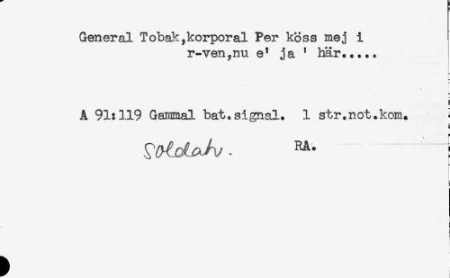 //// General Tobak,korporal Per köss mej i //// r-ven,nu e^ ja * här..... //// A 91:119 Gammal bat. signal. 1 str.not.kom. i //// s ////