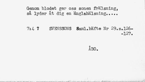 //// Genom blodet ger oss sonen frälsning, //// så lyder åt dig en änglahälsning..... //// 7:4 ? SVENSSONS 3aml.häfte Nr 29.s.126- //// -127. //// ÅBO. ////