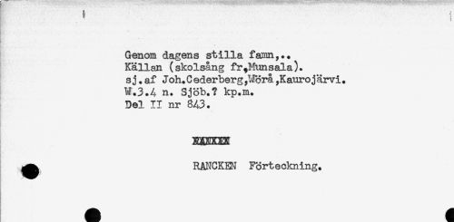 //// p,. ..... //// Genom dagens stilla famn,.. //// Källan (skolsång fr+Munsala). //// s j. af Joh.Cederberg,^rå ,Kaurojärvi. //// W.3.4 n. Sjöb.? kp.m. //// Del II nr 843. //// * //// - //// . //// ! //// EXEXm //// ^ RANCKEN Förteckning. ////
