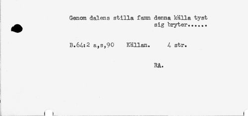 //// t! //// Genom dalens stilla famn denna källa tyst //// ^^^ sig bryter...... //// B.64:2 a,s,90 Källan. 4 str. //// i //// RÅ. //// i //// I //// t //// ____< L _____! ////