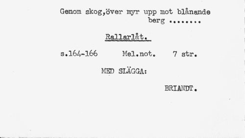 //// Genom skog,över myr upp mot blånande ' //// berg ... ' //// Rallarlåt. //// S.16A-166 Mel.not. 7 str. //// i //// MED SLÄGGA: //// BRIANDT. //// 1 //// < ////