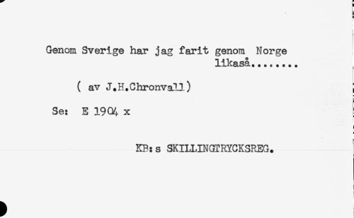 //// i //// 4 //// Genom Sverige har jag farit genom Norge //// likaså... //// ( av J.H.Chronvall) //// Se: E 1904 x //// KB:s SKILLINGTRYCKSREG. //// ; ////