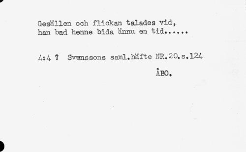 //// Gesällen och flickan talades vid, //// han bad henne bida ännu en tid...... //// A:4 ? Svenssons saial.häfte NR. 20. s. 124 //// ÅBO. ////