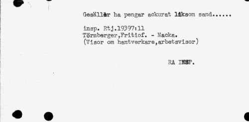 //// ^ ! //// GesällAr ha pengar ackurat l&ksom sand...... //// insp. Rtj.19397:11 //// TSmberger,Fritiof. - Nacka. //// (Visor om hantverkare ,arbetsvisor) //// RA IN3P. //// * //// ' //// - ////