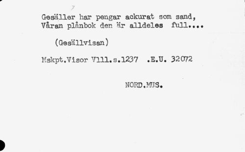 //// Gesäller har pengar ackurat som sand, //// Våran plånbok den är alldeles full.... //// (Gesällvisan) //// Kskpt.VisorVlll.s.1237 .E.U. 32072 //// NORD.MUS. ////