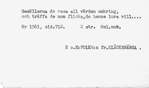 //// Gesällerna de resa all värden omkring, //// och träffa de non flicka,de henne lura vill.... //// Nr 1561, sid.712. 2 str. Mel.noi?. //// H o.E:FOIKM:n fr.KLÄCKEBARGÅ . //// \ //// L....-...----.---.-----.--:---^----- .. ////