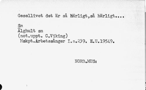 //// Gesellivet det är så härligt,så härligt..,. //// Sm //// Älghult sn //// (not.uppt. C.Viking) //// Mskpt.Arbetssånger I.s.239. E.U.19549. //// NORD.MUS: ////
