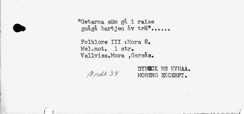 //// ^ "Getarna söm ga i raise //// ^^ gnaga bart j en åv trä"...... //// I Folklore III :Mora 8. //// Mel.not. 1 str. //// Vallvisa.Mora ,Carsås. //// DYBECK MS KVHAA. //// /Y^z^ 3 ^ MOBERG EXCERPT. ////