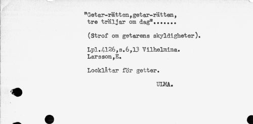 //// "Getar-rätten,getar-rätten, //// tre träljar om dag"....... //// (Strof om getarens skyldigheter). //// Lpl.4126,s.6,13 Vilhelnina. //// Larsson //// t //// Locklåtar för getter. //// ULMA. ////