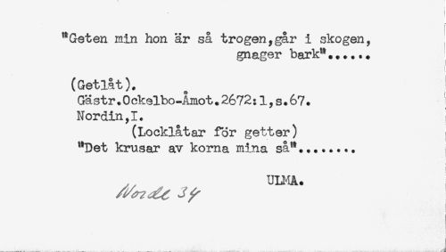 //// "Geten min hon är så trogen,gar i skogen, //// gnager bark"...... //// j //// (Getlåt). //// Gästr.0 ckelbo-Amot.2672:1,s.67. //// Nordin,I. //// (Locklåtar för getter) //// "Det krusar av korna mina så"... //// < //// UMA. ////