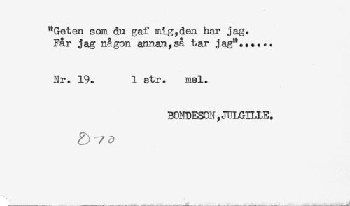 //// "Geten som du gaf mig,den har jag. //// Får jag någon annan,så tar jag"...... //// Nr. 19. 1 str. mel. //// BONDESON, JULGILLE. ////