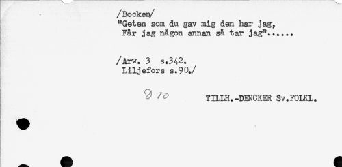 //// /Bocken //// /"Geten som du gav mig den har jag, //// Får jag någon annan så tar jag"...... //// /Årw. 3 s.3A2. //// Liljefors s.90. //// /i //// 9 7<3 TILLH.-DENCKER Sv.FOLKL. ////