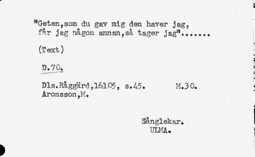 //// "Geten,som du gav mig den haver jag, //// får jag någon annan,så tager jag"....... //// = //// (Text) ; //// H //// D.70. //// Dis.Råggärd,16105, s.45. M.30. ^ //// Aronsson,M. //// Sånglekar. //// UH-1A. ! //// i ////