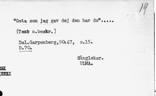 //// /f //// "Geta son jag gav dej den har du"..... //// . .. .. ' --* ** //// (Text o.beskr.) //// -A -- . . . .... . //// Dal. Garpenber g, 9 0: A7, s. 15. //// D.70. //// Sånglekar. //// ULMA. //// CK ////