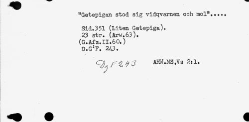 //// "Getepigan stod sig vidqvarnen och mol"..... //// Sid.351 (Liten Getepiga). //// 23 str. (Arw.63). //// (G.Afz.11.60.) //// D.G*F. 2A3. //// Q /r ^ ^ J AK.V.MS Js 2:1. //// - ////
