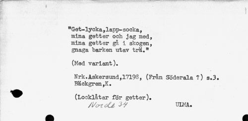 //// f ! //// "Get-lycka,lapp-socka, //// mina getter och jag med, //// mina getter gå i skogen, //// gnaga barken utav trä." //// (Hed variant). //// < //// Nrk.Askersund,17198, (Från Söderala ?) s.3. //// Bäckgren //// ^^ (Locklåtar för getter). ////