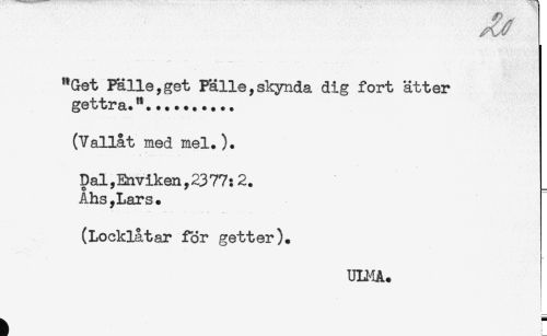 //// "Get Pälle,get Palle,skynda dig fort ätter //// gettra."..... //// (Vallat med mel.). //// Dal,Enviken,2377:2. //// Ahs,Lars. //// (LockLåtar for getter). ////