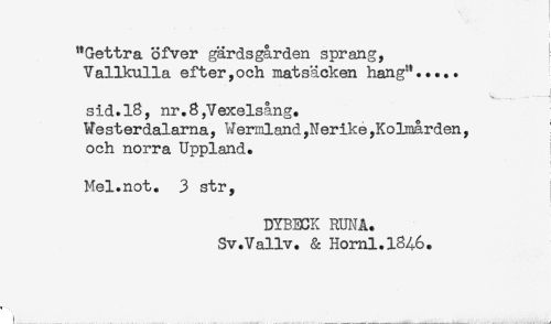 //// "Gettra öfver gärdsgården sprang, //// Vallkulla efter,och matsäcken hang"..... //// - ***-** //// sid.18, nr.8,Vexelsång. //// Westerdalarna, ¥ermland,Nerike,Kolmården, ! //// och norra Uppland. ! //// Mel.not. 3 str, //// DYBECK RUNA. //// Sv.Vallv. & Homl.1846. ////
