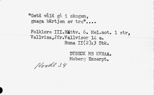 //// ) //// ! //// "Getä vålä gå i skogen, ; //// gnaga bärtjen av tra".... //// i //// - //// Folklore III.RRttv. 6. Mel.not. 1 str, //// Vallvisa,Jfr .Vallvisor 14 a. - //// Runa 11(2):3 Dbk. ! //// i //// DYB5EK MS KVHAA. //// Moberg Excerpt. ////