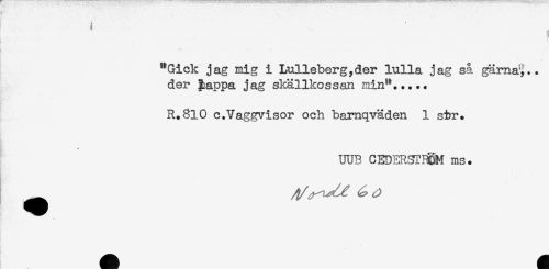 //// t i ' //// ! //// K'-': * . . //// i'*, ' ' . _ " * - " - - //// "Gick jag mig i Lulleberg,der lulla jag så gärna,.. //// der ^appa jag skällkossan min"..... //// R.810 c.Vaggvisor och barnqväden 1 str. //// UUB GEDER3TBDM ms. //// - ////