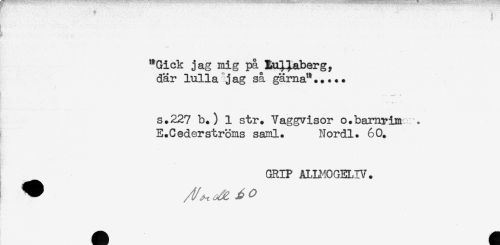 //// - ' ' . ; //// t!- //// "Gick jag mig på tu^aberg, //// där lulla jag så gärna"..... //// ... - -< //// - V 1*" //// s.227 b.) 1 str. Vaggvisor o.bamrim : . //// E.C eder ströms sarnl. Nordl. 60. //// GRIP ALU10GELIV. ////