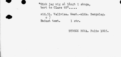 //// ^ ^Gick jag mig sa långt i skoga, //// bort te Olars tä"..... //// i //// j //// ^^^ sid.51. Vallvisa. West.-Dilds. Bergslag. //// Endast text. 1 str. //// DYBECK RUNA. Folio 1865. //// t //// { //// å //// t ^ ////