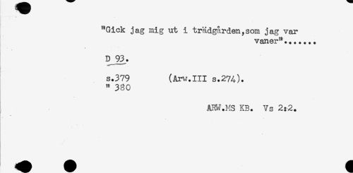 //// * - //// ^Gick jag mig ut i trädgården,som jag var //// vaner"....... //// < //// D 93. //// s.379 (Arv^.III s.27A). //// " 380 //// * //// ARW.MS KB. Vs 2:2. ////