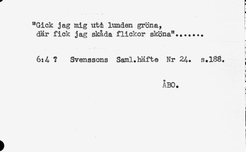 //// < //// "Gick jag mig uti lunden gröna, //// där fick jag skada flickor sköna"....... //// r //// ! //// - ' . ' [ //// C //// 6:4 ? Svenssons Saml.häfte Nr 24. s.188. ? //// Å Bo. ; //// < //// t //// j //// å ' I ////