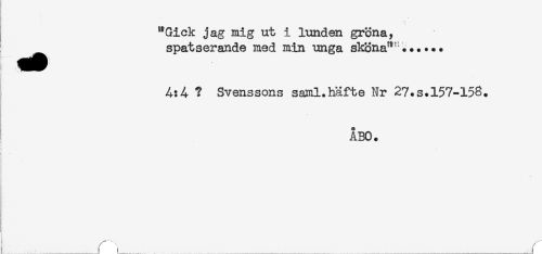 //// "Gick jag mig ut i lunden gröna, //// ^^ spatserande med min unga sköna" ...... //// 4:4 ? Svenssons saml.häfte Nr 27.s.157-158. //// ÅBO. //// i //// * //// !.......r.....t....___ //// /