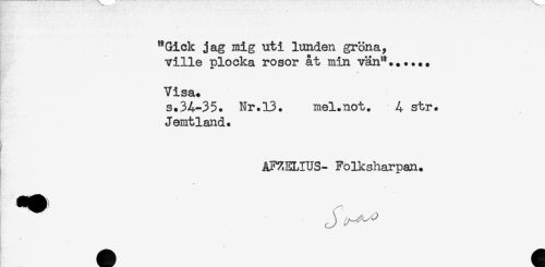 //// *Gick jag mig uti lunden gröna, //// ville plocka rosor åt min vän** + . + ..+ //// - //// . //// Visa. //// s.34-35. Nr.13. mel.not. 4 str. //// * //// Jemtland. //// AFKELIUS- Folksharpan. //// J ^^ ////