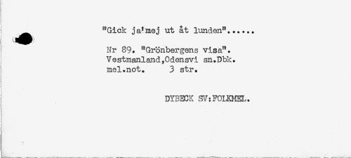 //// ^Gick ja^mej ut åt lunden"...... //// Nr 89. ^Grönbergens visa^. //// VestmanlandyOdensvi sn.Dbk. //// mel.not. 3 str. //// i //// ! //// { //// DYBECK SV:FOLKMEL. //// . //// i * //// L //// 5 //// i. //// * - ////