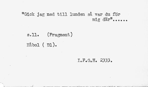 //// "Gick jag ned till lunden så var du för //// mig där^...... //// s.ll. (Fragment) //// Håbol (Dl). //// I.F.G.H. 2333. ////