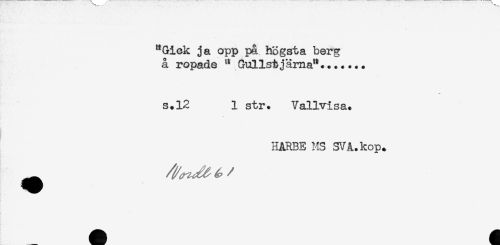 //// "Gick ja opp på högsta berg //// å ropade ^ Gullstjäma"....... //// s.12 1 str. Vallvisa. //// HARBE MS SVA.kop* ////