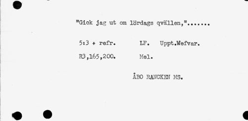 //// "Gick jag ut om lördags qvällen,"....... //// 5:3 + refr. LF. Uppt.Mefvar. //// R3,165,200. Mel. //// ÅBO RANCKEM MS. //// - ////