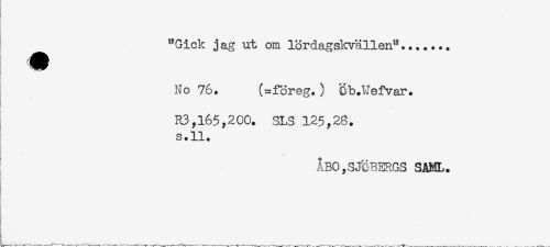 //// t //// ) //// "Gick jag ut om lördagskvällen"....... //// No 76. (=föreg.) Öb.Wefvar. //// R3,165,2CO. SLS 125,28. //// s.ll. //// ÅBO,SJÖBERGS SAML. //// t ////