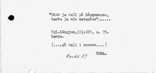//// ^^ "Gick ja vall på Långemosse, //// tapte ja min matapåse"...... //// Vgl.Längjum,lll:235? s. 95. //// Lampa. //// I (.... gå vall i mossen....) //// ! //// j //// . //// ^ , ULMA. //// % //// ^^ _____ ____ ____ f' ////