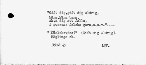 //// - //// ^ "Gift dig,gift dig aldrig, //// ^^^ kära, kär a barn, //// akta dig att falla? //// i gossens falska garn,o.s.v.^.... //// ! //// "(Kärleksvisa)" (Gift dig aldrig). //// Höglinge sk. //// 3512:45 LUF. //// K ' //// ^ ---1---- -----, - ----.T,,,^-.--.,. --- --- ////