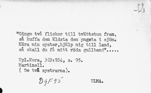//// ; //// "Gingo två flickor till tvättstun fram, //// så kuffa den äldsta den yngsta i sjönj //// Kära min syster,hjälp mig till land, //// så skall du få mitt roda gullband"..... //// Upl.Nora, 3C3:93A, s. 95. //// Martineli. //// ( Pe två systrarna). //// ULMA. ////