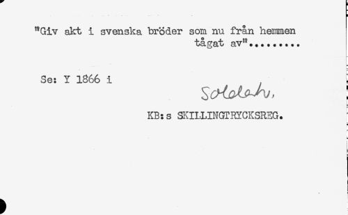 //// ..... //// "Giv akt i svenska bröder som nu från hemmen //// tågat av".... //// Se: Y 1866 i ! //// KB:s SKILLINGTRYCKSREG. //// B ////
