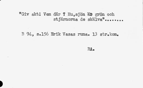 //// "Giv akti Vem där ? Hu,sjHn ät grön och //// stjärnorna de skälva"... //// < //// B %, s.156 Erik Vasas runa. 13 str.kom. //// RA. ////