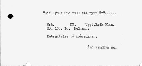 //// "Gif lycka Gud till ett nytt år"...... //// y //// 8:6. NB. Uppt.Erik Olin. //// R3, 158. 16. Mel.ang. //// BetrsJ^telse på nyårsdagen. //// i //// ÅBO RANCKEt? MS. //// ! //// t //// ! //// ! ////