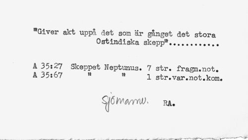 //// "Giver akt uppå det som är gånget det stora //// Ost indiska skepp"....... //// Å 35:27 Skeppet Neptunus. 7 str. fragm.not. //// A 35:67 " " i str.var.not.kom. //// RA. ////