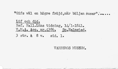 //// "Gifs väl en högre fröjd,när böljan susar"...... //// Lif och död. //// Ref. Hall.Läns tidning, lVl-1841. //// V.M.A. Acc. nr.4.386. Sn.Halmstad. //// 3 str. & 8 v. sid. 1. //// VåRBERGS MUSEC!^. ////