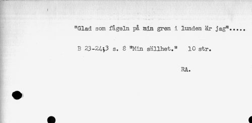 //// < //// ^Glad son fågeln på min gren i lunden är jag"..... //// B 23-24p s. 6 sällhet." 10 str. //// RA. ////