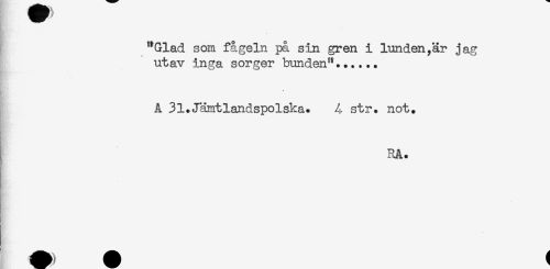 //// "Glad som fågeln på sin gren i lunden,är jag //// utav inga sorger bunden"...... //// Å 31.Jämtlandspolska. 4 str. not. //// ) RA. //// S' //// & ////