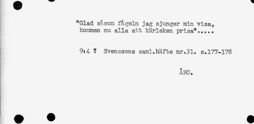 //// "Glad såsom fågeln jag sjunger min visa, //// kommen nu alla att kärleken prisa"..... //// * //// 9:4 ? Svenssons saml.häfte nr.31. s.177-178 //// I ÅBO. ////