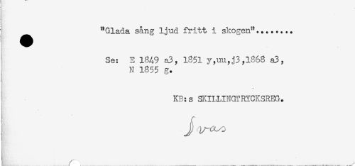 //// i //// ) //// a //// ' "Glada sång ljud fritt i skogen"... //// Se: E 18A9 a3, 1851 y,uu,j3,l868 a3, //// N 1855 g. //// KB:s SKILLINGTRYCKSREG. //// ! r ____^ - ////