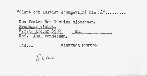 //// "Glatt och lustigt sjuagavi,hå hia ha".... //// Den femte: Den lustiga sjömannen. //// Fraam.av visbok. //// V.M.Å. Åcc.nr 35^ _3n..... ... _ __ //// Ref. Åug. Bondessen. //// sid.3. VARBERGS MUSEUi:: ////
