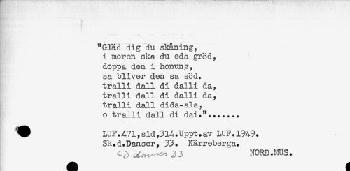 //// "Gläd dig du skåning, //// i moren ska du eda gröd, //// doppa den i honung, //// sa bliver den sa söd. //// tralli dall di dalli da, //// tralli dall di dalli da, //// tralli dall dida-ala, //// o tralli dall di dai."....... //// LUF.A71,sid,314.Uppt.av LUF.1%9. //// Sk.d.Danser, 33. Kärreberga. //// ^^n-MKH J J ^ORD .MUS. ////